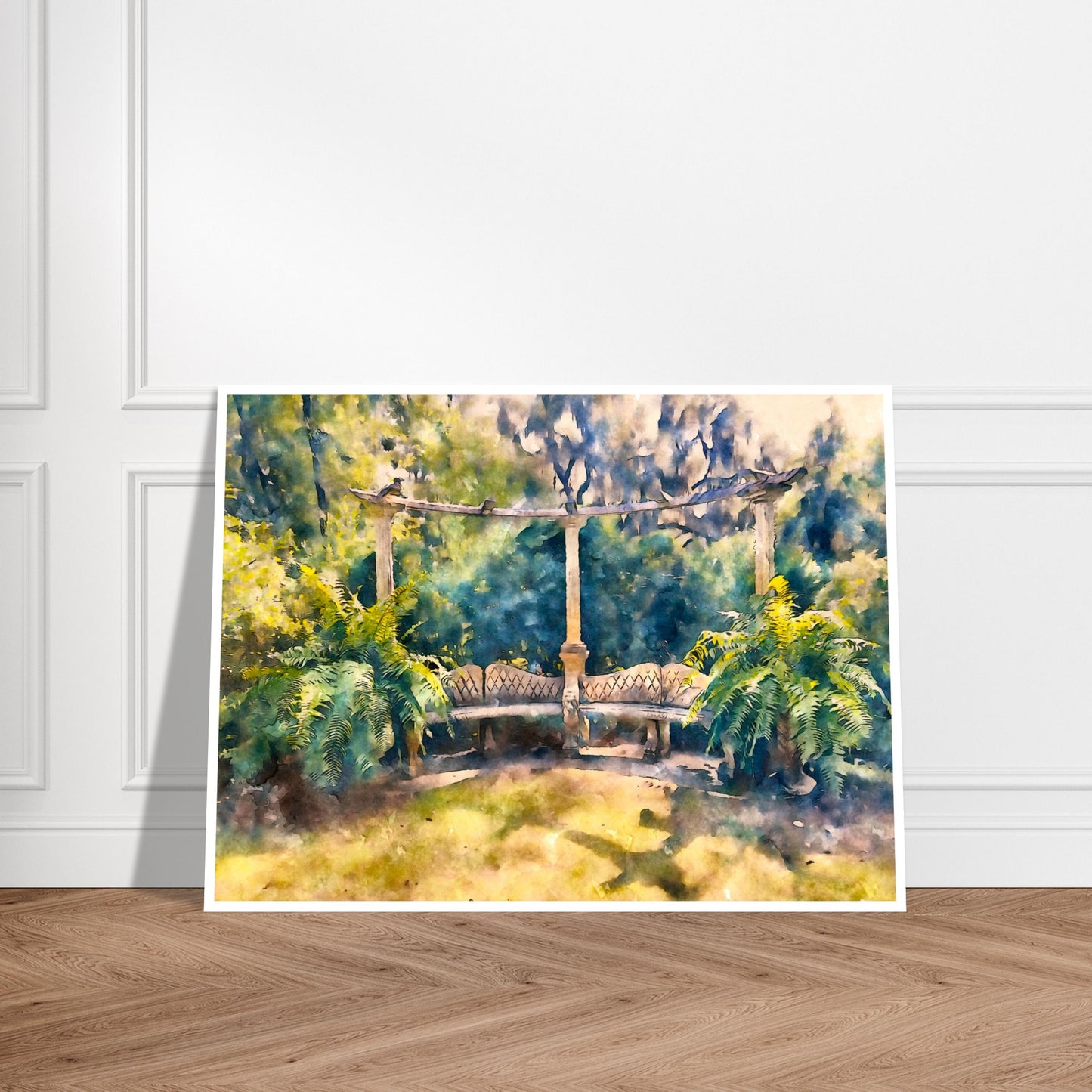 Stunning digital watercolor of a sun-dappled stone bench nestled under a weathered trellis, surrounded by lush greenery within the tranquil setting of Airlie Gardens, Wilmington, North Carolina.