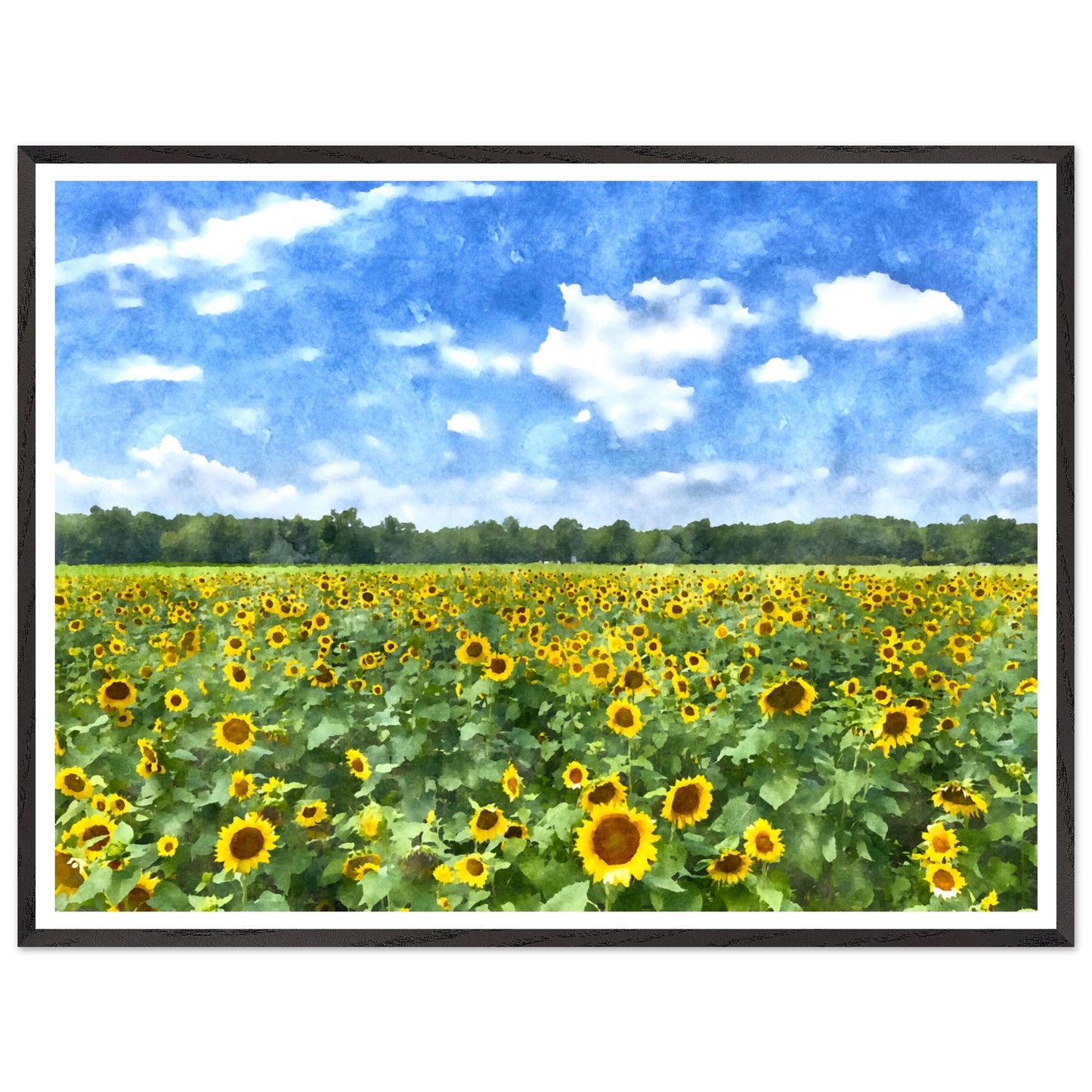 Stunning watercolor print of a bright blue sky and a field of vibrant yellow sunflowers in full bloom.