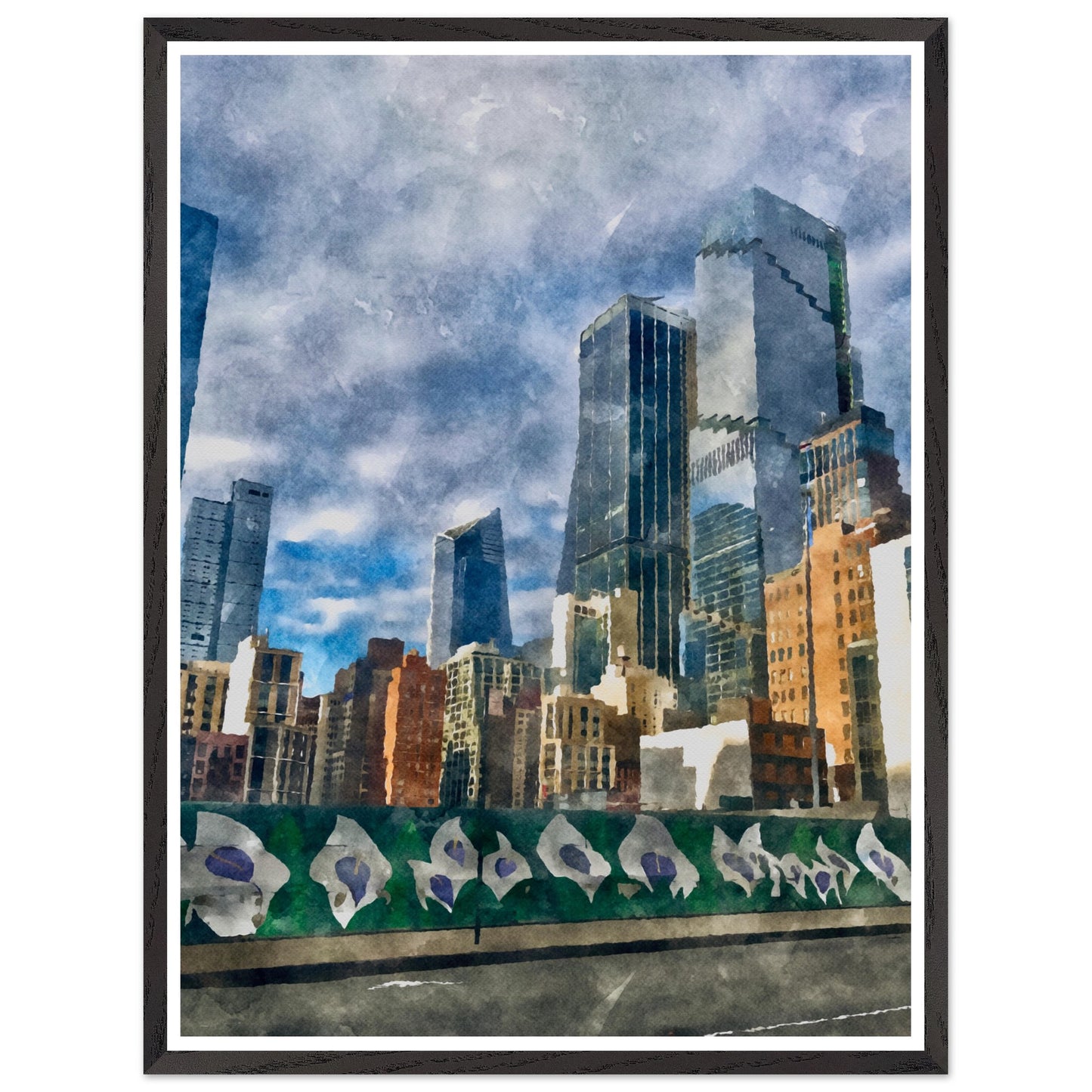 Stunning digital watercolor print of the "Flowers in the City" mural and Midtown skyline in the background. Located in Hell's Kitchen, Manhattan, New York.