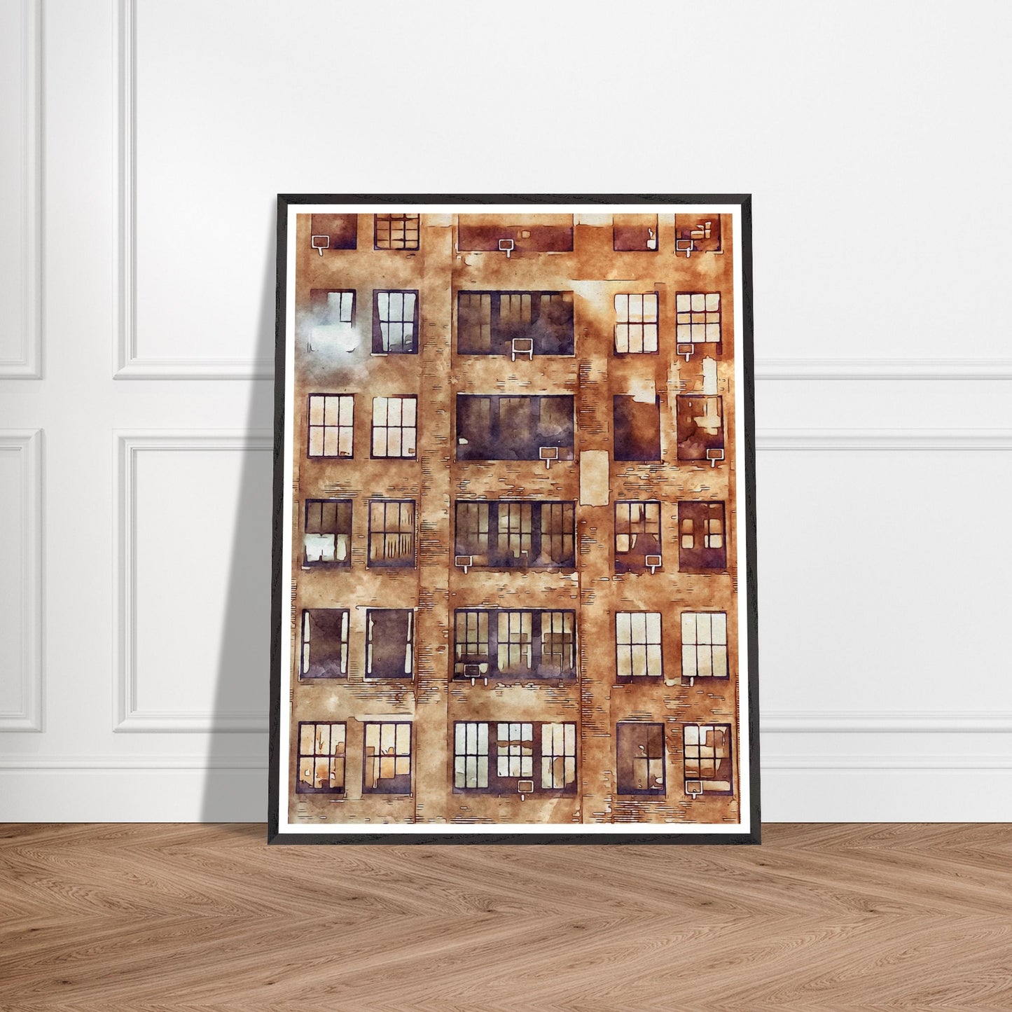 Stunning digital watercolor print of the brick and stone lofts characteristic of the Garment District in Manhattan, New York.